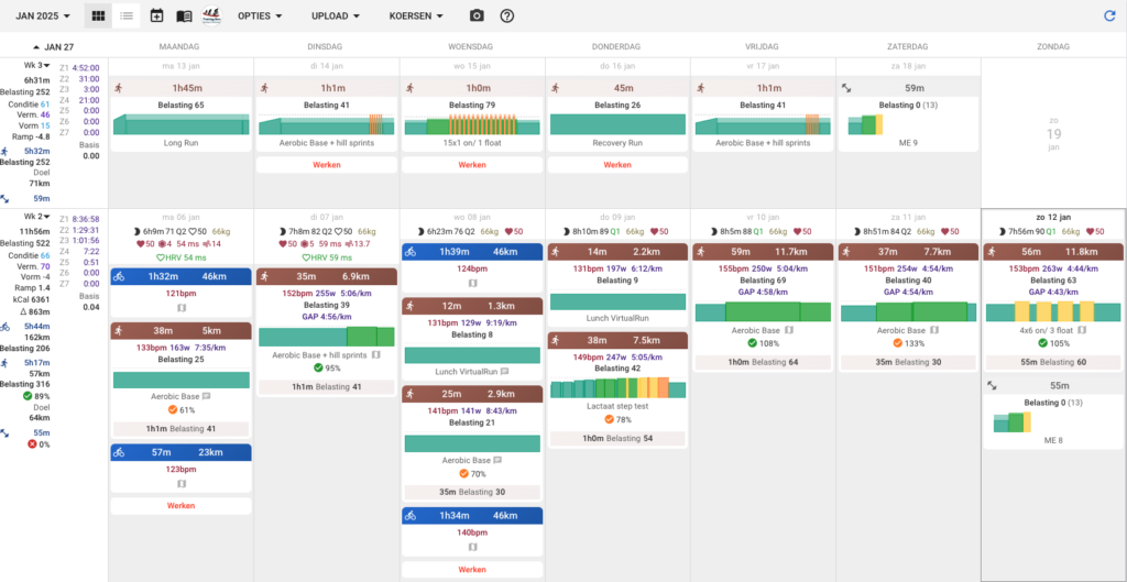 Het trainingsschema wordt wekelijks bijgewerkt, zodat het altijd aansluit bij jouw voortgang. Open en regelmatige communicatie staat hierbij centraal. Door een vlotte wisselwerking tussen atleet en trainer kunnen we snel bijsturen en het maximale uit je trainingen halen. Deze efficiënte en flexibele aanpak garandeert een optimaal resultaat en helpt je om je sportieve doelen sneller te bereiken.